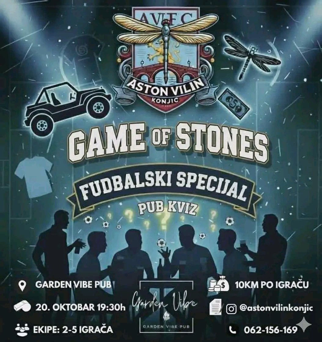 Neformalna grupa mladih ljudi okupljena oko udruženja “Aston Vilin Konjic” organizator je nogometnog pub kviza koji će biti održan u Garden Pub klubu u ponedjeljak 20.10. sa početkom u 19:30 Organizatori očekuju dolazak više od
